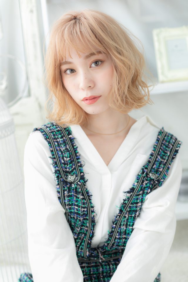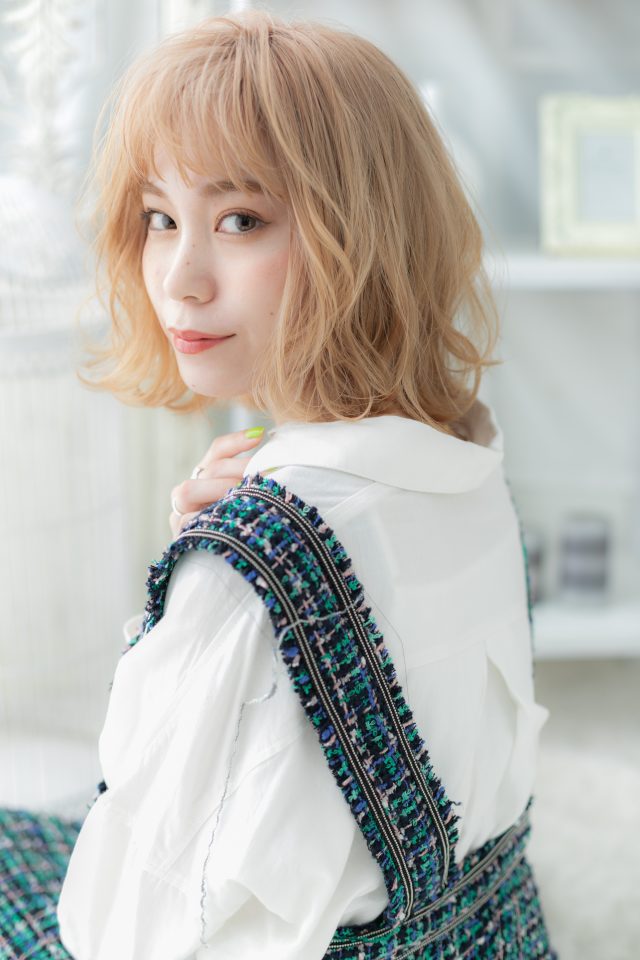 くせ毛風ゆるふわミディはハイトーンカラーで甘辛ミックスに。耳かけや小顔前下がりも大人かわいい。ナチュラルボブやフェミニンボブ、大人ボブや前下がりボブからの伸ばしかけに◎斜めバングや厚めバングで目力強調。
