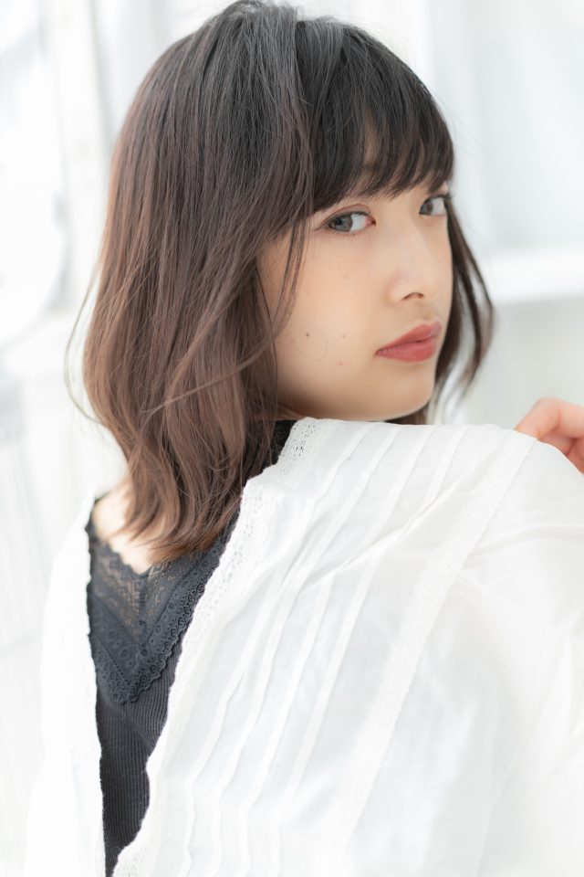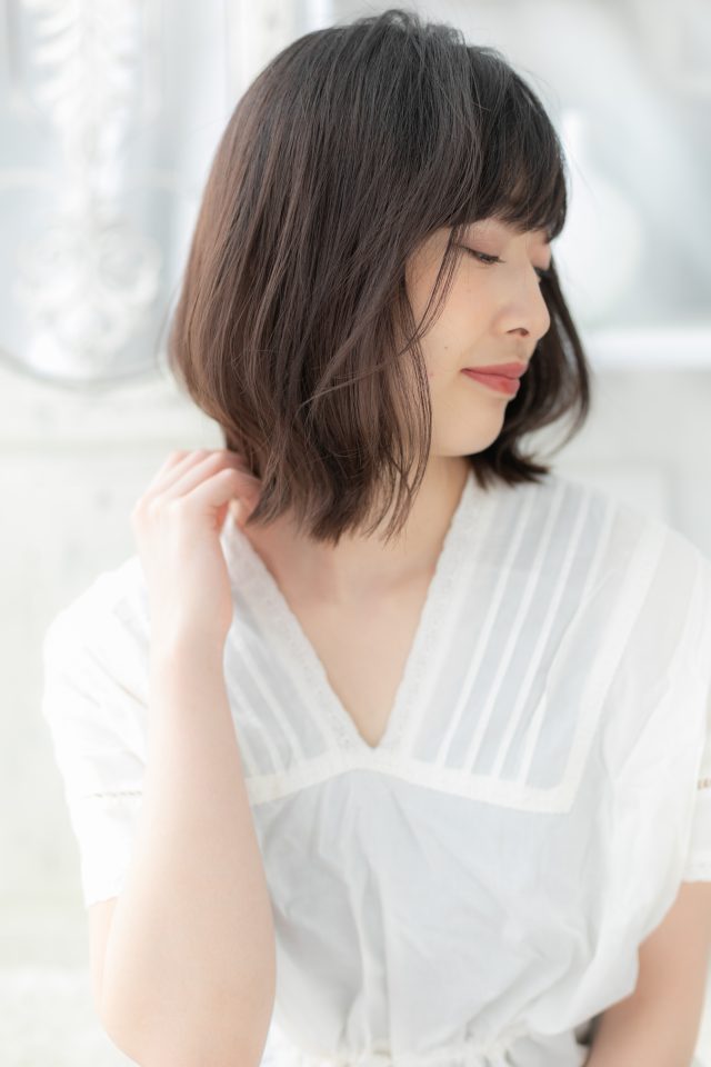 透け感斜めバングや厚めバングで目力強調。ナチュラルボブやフェミニンボブ、大人ボブや前下がりボブからの伸ばしかけに◎くせ毛風ふわミディや耳かけも大人かわいい。前下がりで小顔に。(メイク担当:川口店 成田)