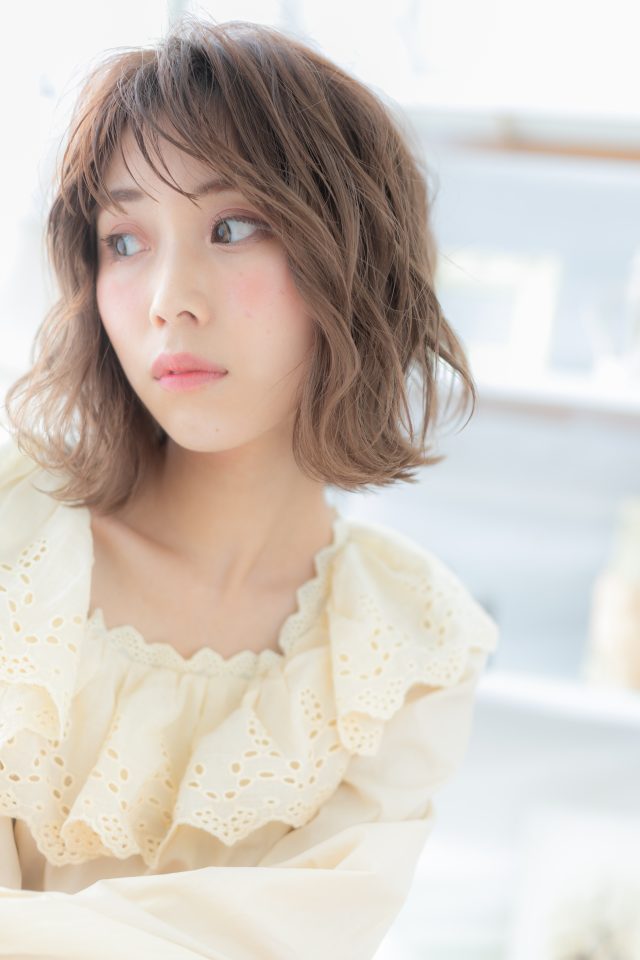 ナチュラルボブ,フェミニンボブ,大人ボブや前下がりボブからのイメチェン◎斜めバングや厚めバング,前下がりシースルーバングも小顔。くせ毛風ゆるふわミディ,耳かけも大人かわいい。(メイク担当:COVERHAIRGROUP伊与田)