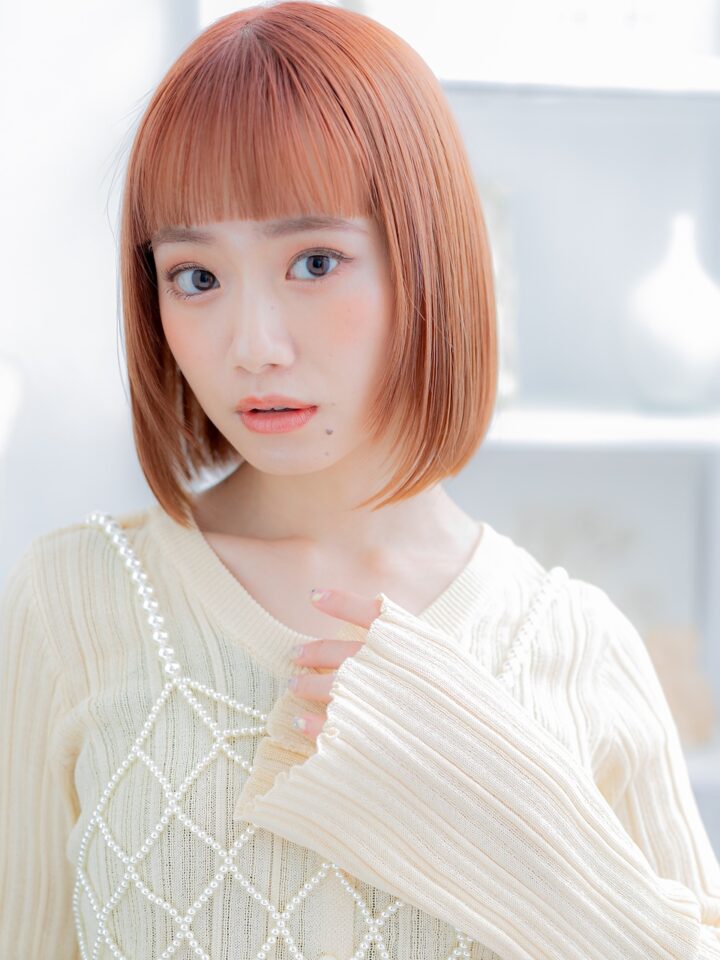 大人可愛いアプリコットオレンジ切りっぱなしボブ20代30代