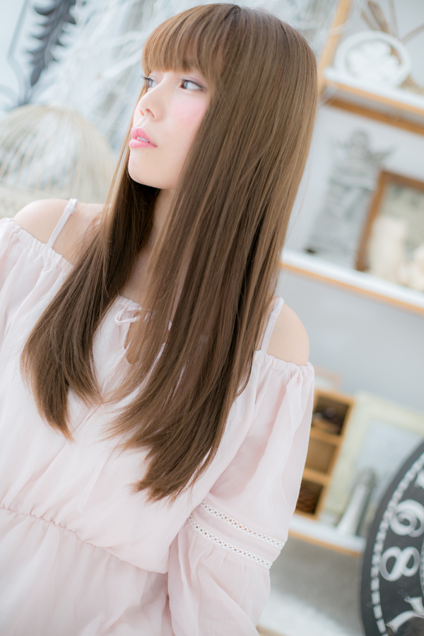 ツヤと透明感光るヘアスタイル♪ナチュラルストレート。グラデーションカラーで立体的に、輪郭カバーして小顔に見せて大人女子のコーデを完成!。厚めバングや斜めバングで目力UPがポイント。前下がりや耳かけも大人かわいい♪人気のカラーで髪の毛の悩みも解消!30代・40代にもおすすめ!(メイク担当:COVER HAIR GROUP 棟方)