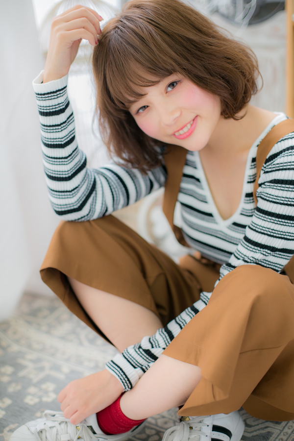 定番のナチュラルなボブスタイルに、ふんわりとした内巻きカールを加え、ツヤ感と透明感のあるミルクティカラーをON。ハーフみたいなニュアンスカラーと、表情をチラ見せする透け感あるシースルーバングで周囲と差ををつけて♪