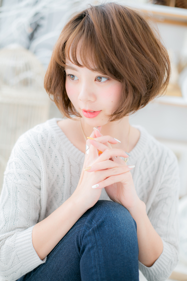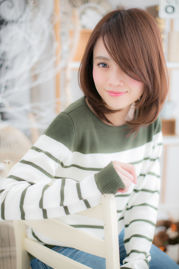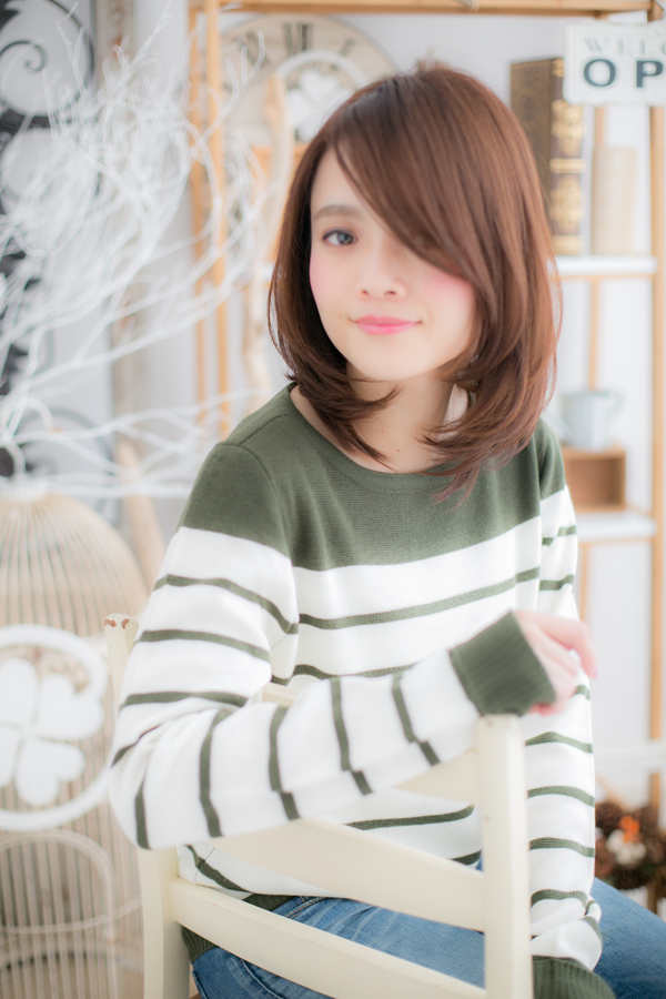顔だちを綺麗に見せてくれるひし形フォルム。サイドに流した斜めバングは、シンプルながらも艶っぽくてGOOD。ツヤカラーで肌色を明るく毛先のレイヤーで軽やかに見せて、上品な清潔感をKEEP!