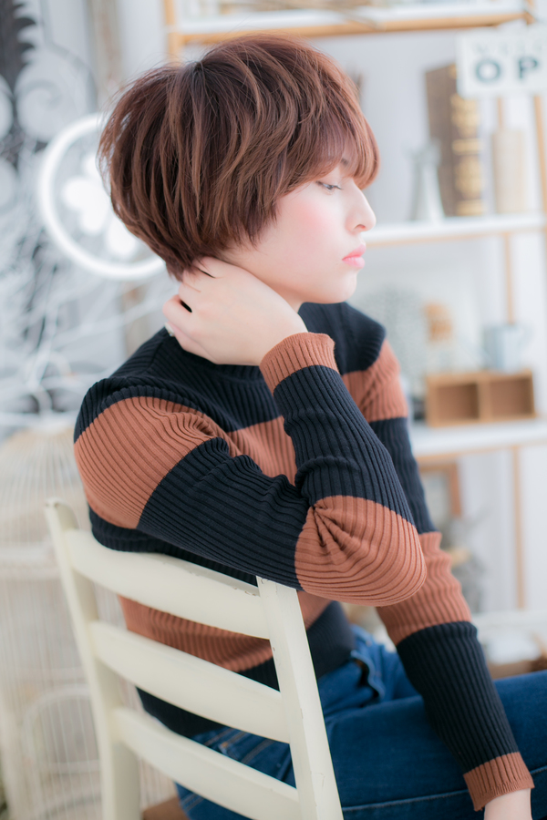 オレンジ系やピンク系のカラーで顔周りを明るくし、クールでカジュアルなカッコカワイイショートに。長めのワイドバングで目力強調!トップにボリュームを持たせて重心を高くすることでスタイルUP効果も。