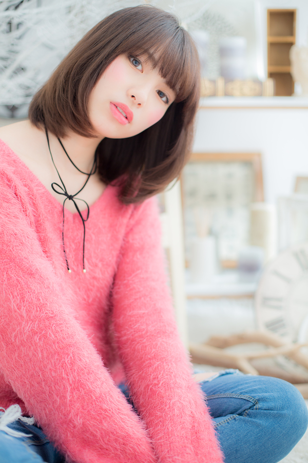 印象的なブラウン系の暗めカラーとぱっつんバングでぐんと存在感もUP!内巻きにまとまりやすくカットもされているのでハネにくくセットもしやすいです☆