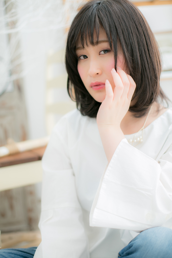 輪郭に沿ってくるんと丸めたワンカールで、フェイスラインをカバーして小顔見せ。斜めバングと黒髪で目元を強調して目力UP!大人かわいい雰囲気に中に、凛としたオーラをプラス。ニュアンスカールで動きをだしても◎ヒアルロン酸カラーは白髪にも対応可。