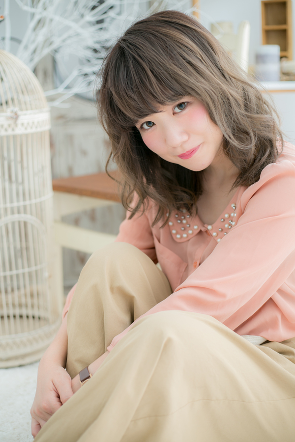 厚めバングとゆるふわカールの重めスタイルがガーリーでカワイイ♪カジュアルにもフェミニンにも合わせやすいマシュマロみたいなふわふわミディ。前髪が伸びてきたら、斜めバングやセンターパートで大人っぽくしても◎