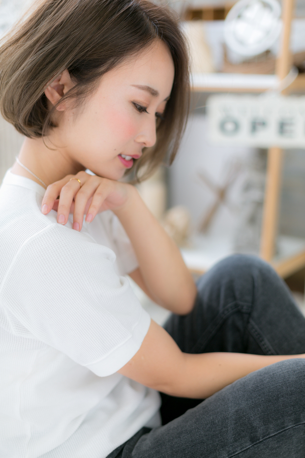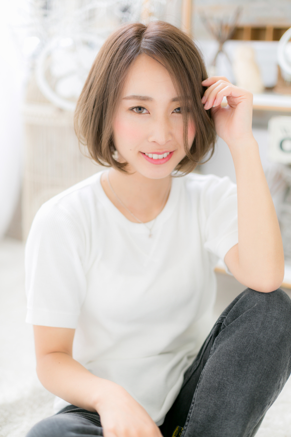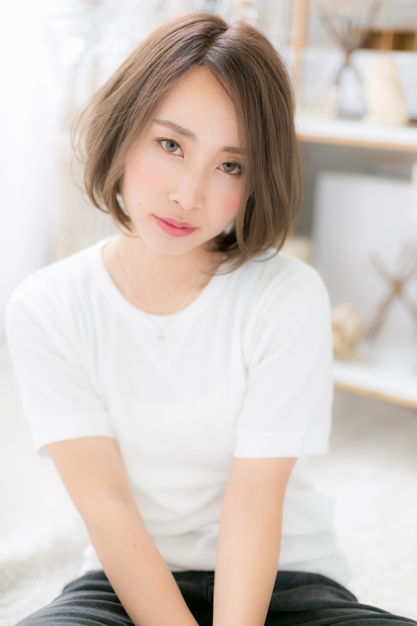 根元を立ち上げるようにドライ。無造作なかきあげが色っぽい。トリートメントバームかソフトワックスをもみこんで完成。前下がりで小顔にしたり、斜めバングや厚めバングで目力UPで美人顔。耳かけやセンターパートも◎ヒアルロン酸カラーは白髪にも対応可。