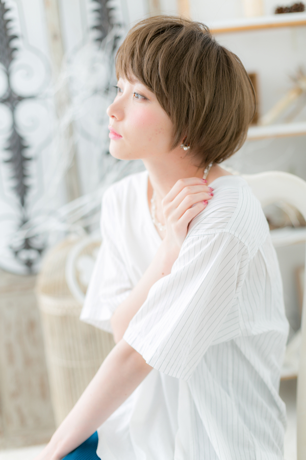 斜めバング&厚めバングで目力強調&前下がりで小顔に仕上げたフェミニンアシメショートのヘアスタイル。デートでもオフィスでもウケバッチリのモテスタイル。大人女子のコーデも完成。カラーはアッシュグレーやグレージュ、ブリーチなしもおすすめ!40代のエラ張り対策にも◎ショートは前髪あり前髪なしもどちらでもGOOD(メイク担当:COVERHAIRGROUP成田)