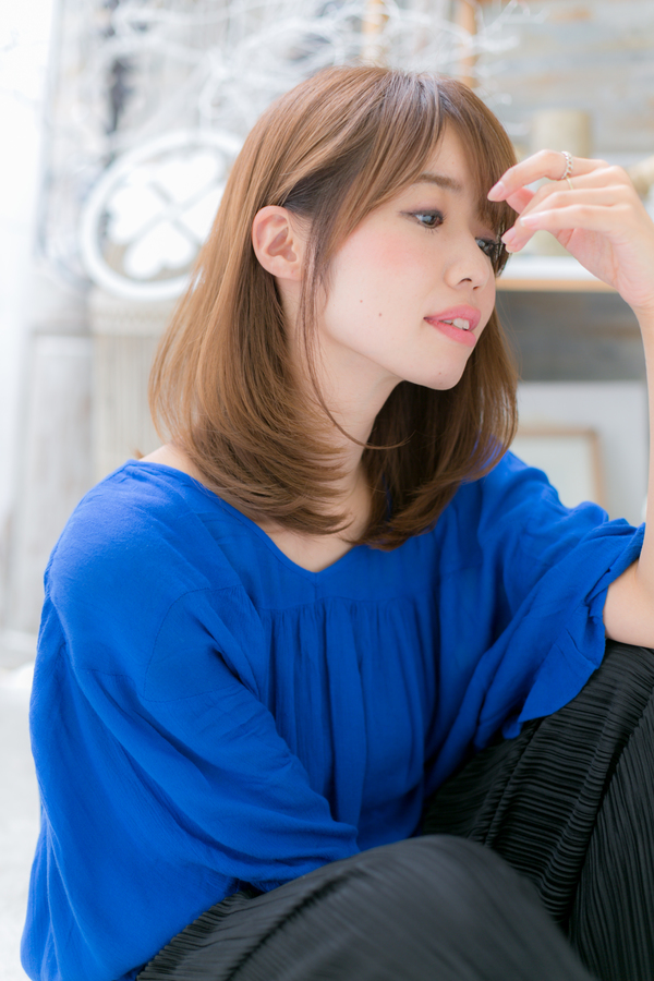 顔周りを包み込むようなレイヤーのヘアスタイルは小顔が期待できます。手ぐしで内巻きになっているので簡単スタイリングOK!斜めバングや厚めバングで目力強調したりで大人女子のファッション度UP♪ミディアムヘアを際立たせるグラデーションやベージュで髪の毛の悩みも解決!(メイク担当:COVERHAIRGROUP棟方)