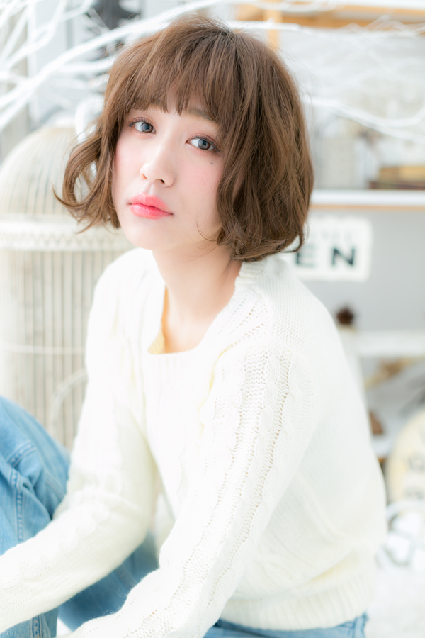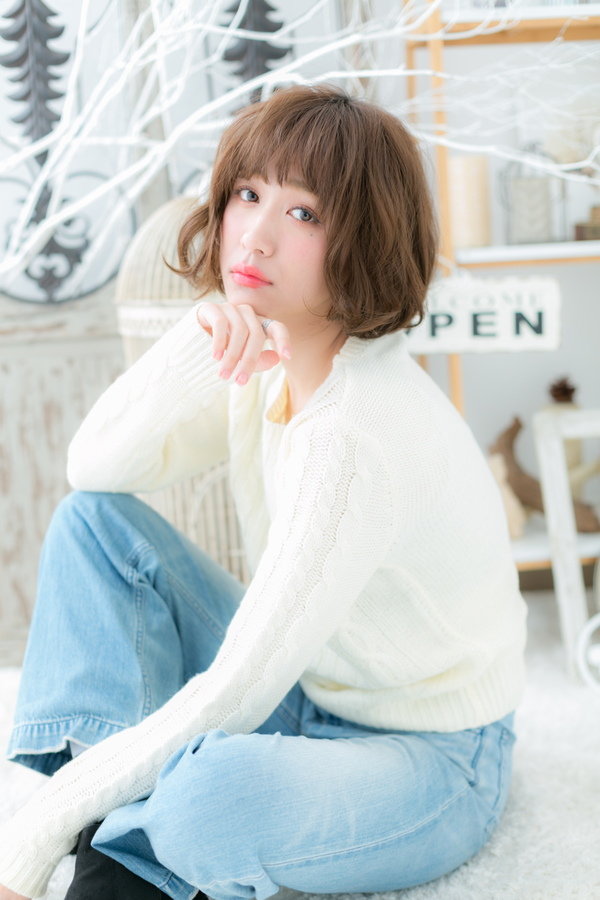 無造作感がキュートなくせ毛風ラフボブのヘアスタイル。前下がりで小顔にしているので、大人女子のコーデも完成!ボブやショート初挑戦の方にも♪ミディアムヘアを際立たせるグラデーションやベージュで暗めの髪の色もおすすめ!40代のエア張りにも◎