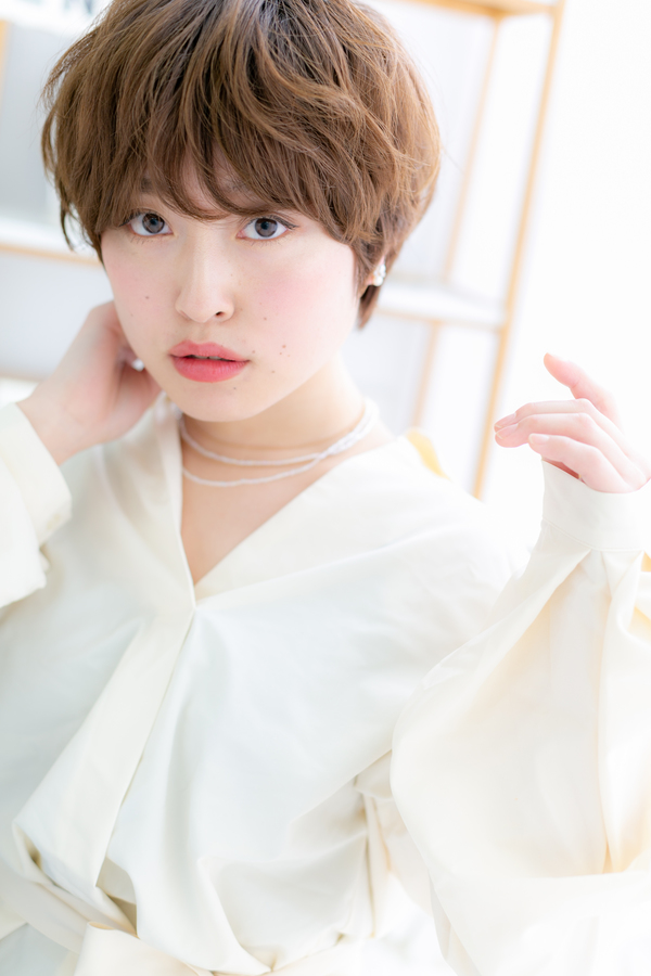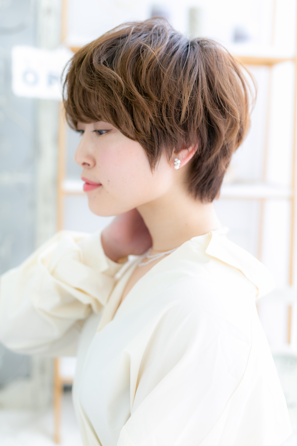 トップにボリュームを持たせてヘアスタイルUP効果を狙ったくせ毛風丸みショート。フェミニンな印象なので大人女子のショートでもエレガントに決まります。トリートメントしたようなカラーリングで髪の毛の悩みも解決!人気のカラーやピンク系のカラーもおすすめ!30代・40代にも◎(メイク担当:北浦和店 棟方)