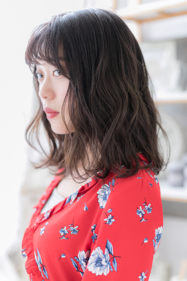 外ハネの毛先が大人かわいいくせ毛風ふわミディ。センターパートで目力UP。斜めバングや厚めバングも旬のヘアスタイルに。アシンメトリーなヘアアレンジや耳かけしても個性的。前下がりで輪郭カバーして小顔見せ効果バッチリで大人女子のコーデを完成。40代のエラ張り対策にもおすすめ!