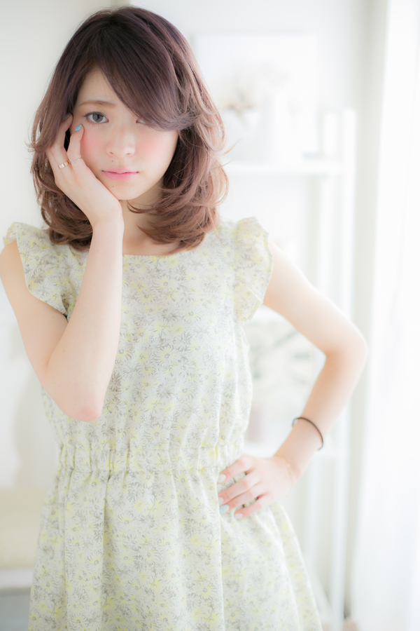 シフォンのような柔らかいエアリーなニュアンスカールが清潔感ある好感ヘアーに☆前髪にもゆるくパーマがっかってるので、斜めバングにしてGOOD。ほつれウェーブやくせ毛風、グラマラスカールにしても大人かわいい♪透明感のあるルミエールカラーがオススメ。