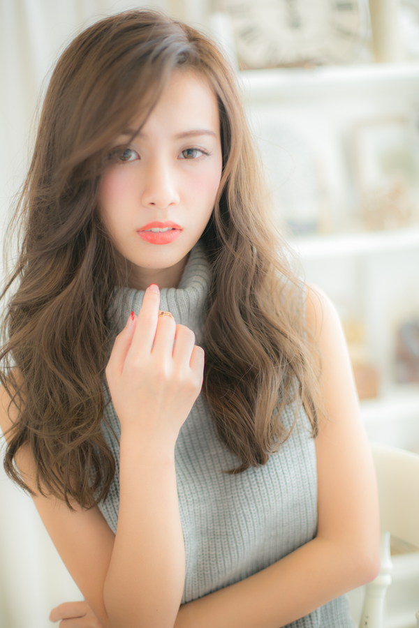 ラフ&ドライな絶妙な質感でイレギュラーな動きが出る、一歩先いく攻め系ロング。表情をチラ見せする斜めバングを合わせれば、誰もが振り向く、フェロモンたっぷり無敵のおフェロスタイルの完成です。髪をルーズに束ねても、こなれ感が出て、ツヤっぽい♪