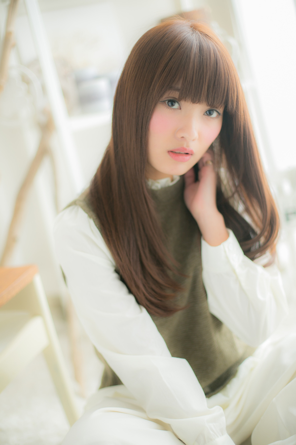 思わずため息が出てしまうくらい綺麗にツヤめく、しっとりまとまった美髪ストレート。低い位置に入れたレイヤーで軽さを出し、目の上ギリギリのパッツンバングで少女らしさを出すことで、オトナっぽくなり過ぎないガーリー乙女ロングに。パッと華やぎます!