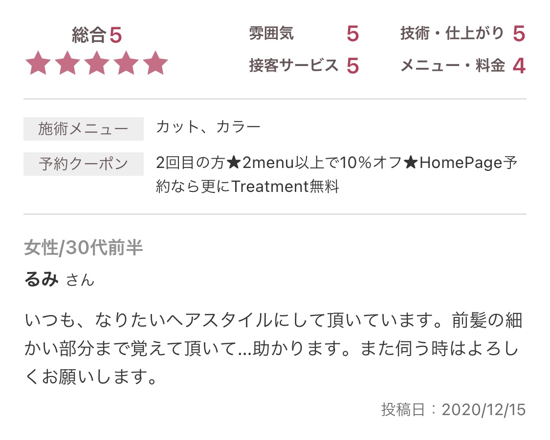お客様から頂いたホットペッパービューティの口コミを中心にご紹介させていただきます。