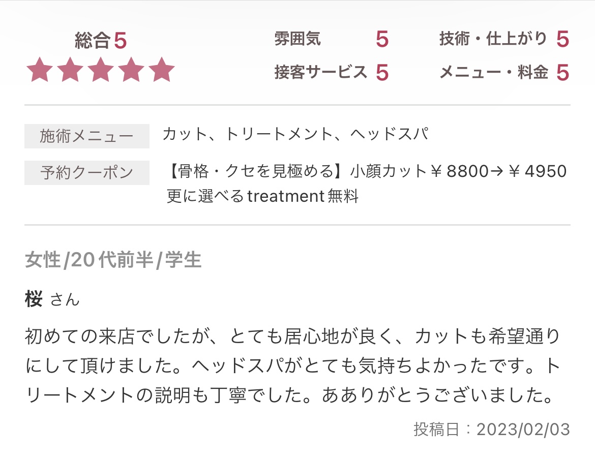 お客様から頂きましたホットペッパービューティの口コミをご紹介させていただきます☆