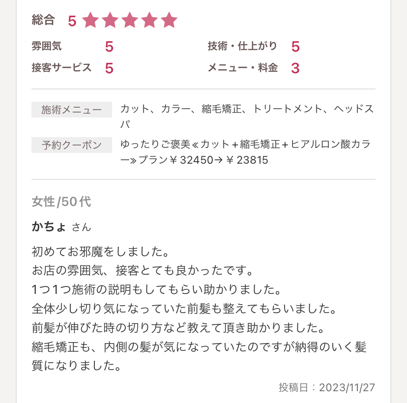 お客様から頂きましたホットペッパービューティの口コミをご紹介させていただきます☆