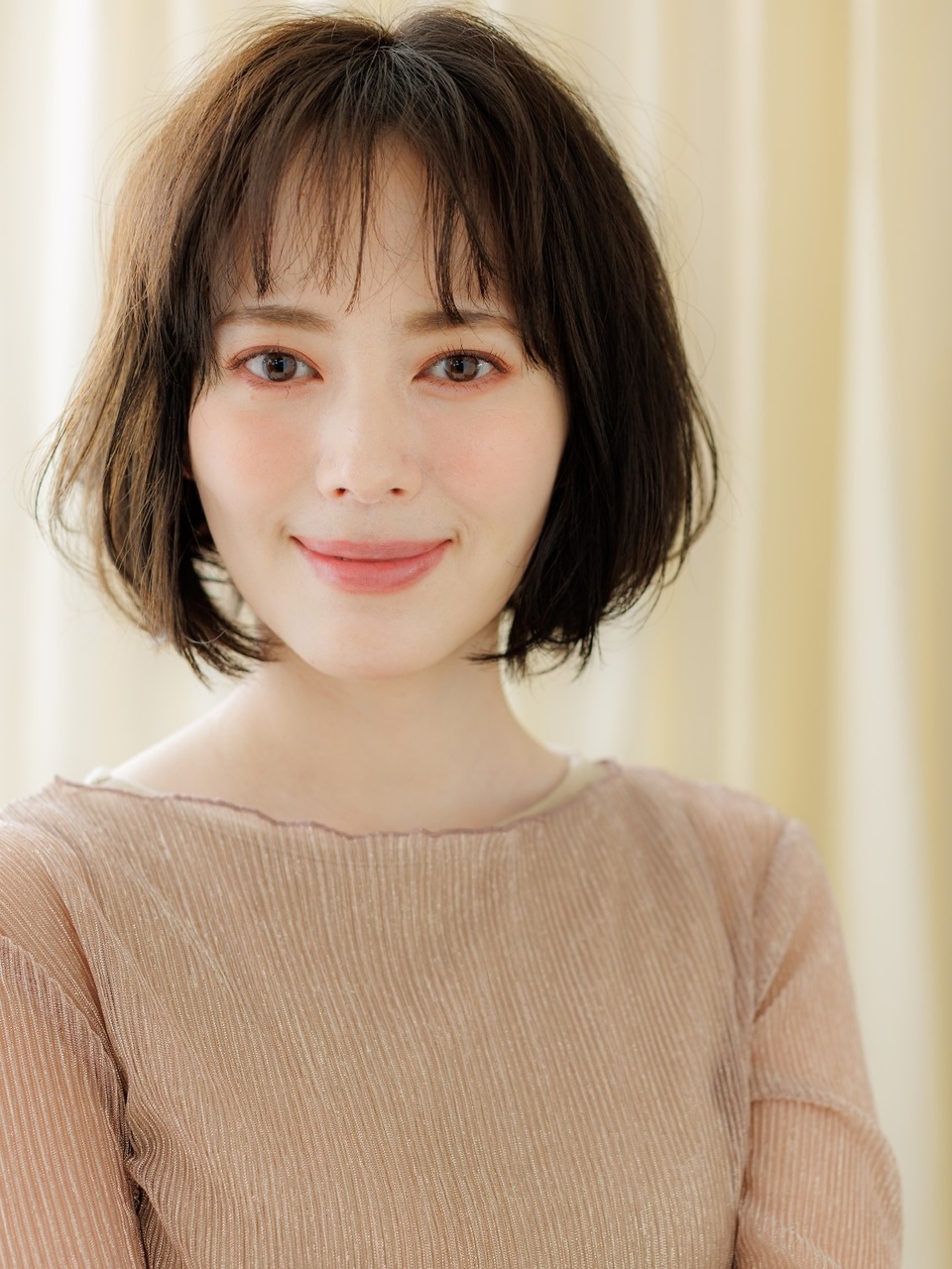 斜めバングや厚めバングで目力UP。前下がりで小顔に。ナチュラルボブやフェミニンボブ、大人ボブや前下がりボブからのイメチェンにGOOD。耳かけやくせ毛風ゆるふわミディも大人かわいい。(メイク担当:北浦和店 成田)