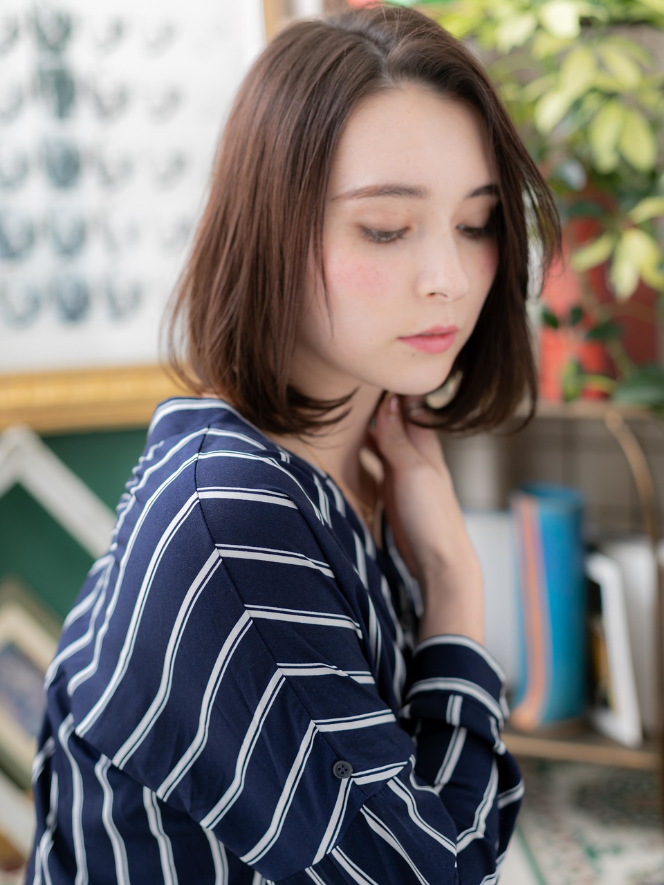 前下がりで小顔にしたナチュラルボブ。フェミニンボブや大人ボブ、前下がりボブの他、くせ毛風ゆるふわミディも大人かわいい。斜めバングや厚めバングで目力UPしてもOK。耳かけもGOOD。(メイク担当:川口店 岩淵)
