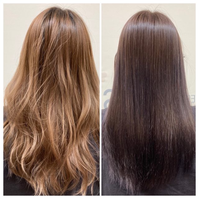 上記記載、独自開発の【艶髪・髪質改善カラー】と『ダメージレスカラー』をMIXした、