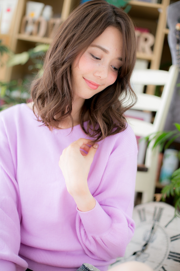 くせ毛風カールがフェミニンで大人かわいいふわミディ☆流し前髪で目目力UP効果も♪。耳かけやワンサイドで色っぽくしてもOK。かきあげでカッコ良くしても◎。スーツも似合うので、デキル女風スタイルもGOOD!(メイク担当:川口店 成田)