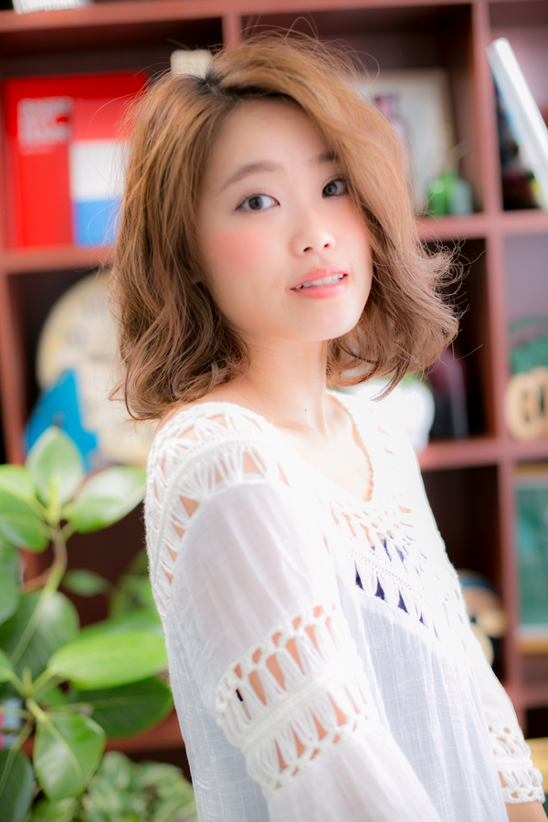 頬の位置でカットして、外巻きパーマをかけた斜めバングがポイント☆顔周りをグッと華やかにしてくれます。アレンジもできちゃのも嬉しい☆