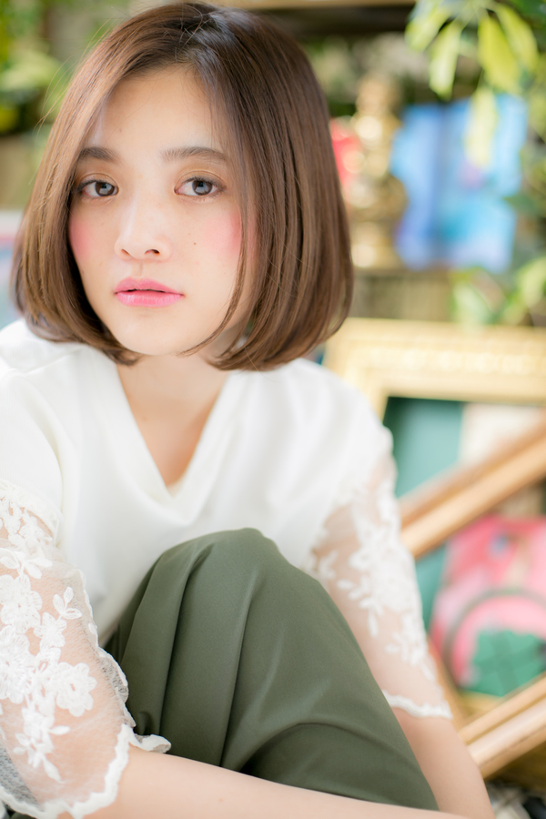 ノーバングxストレートのナチュラルボブ。ツヤカラーと合わせて透明感を引き出せば、美髪大人ボブに♪顔周りを包み込んで小顔に見せ、スッキリ美人顔に格上げ。前下がりも◎オフィスでもデートでも使える万能ボブです。