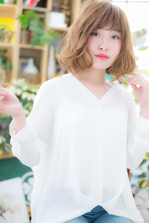 耳横でふわっと広がるAラインシルエットで小顔に仕上げたふわミディのヘアスタイル。くせ毛風カールと斜めバングが大人かわいい。ベージュカラーやミディアムヘアを際立たせるグラデーションカラーで顔周りをグラマラスに。トリートメントしたようなカラーリングで髪の毛の悩みも解決!人気のカラーやアッシュグレー、ブリーチなしもおすすめ☆オン眉や切りっぱなしボブも個性的で大人女子のファション度UP◎30代・40代にも◎