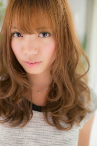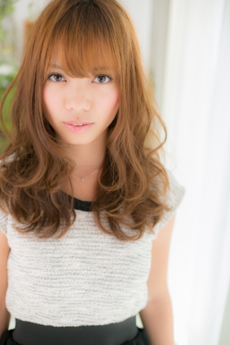 ロングスタイルにレイヤーをいれ,パーマの動きが出やすく。10トーンのキャラメルカラーで柔かい女性らしいスタイルに。マーメイドアッシュや,ベージュカラーもイチオシ!厚めバングで小顔効果と,大人かわいいフェミニンロング。大きめカール,ラフウェーブも