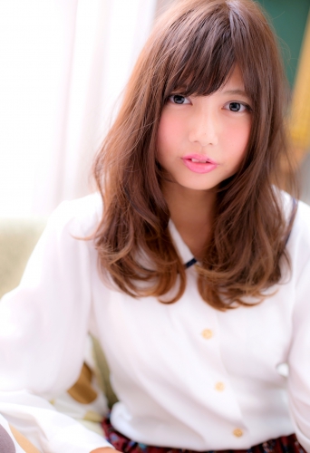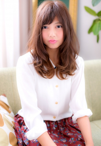 根元はツヤのストレート,毛先はワンカールのパーマをつけ,ツヤとルーズ感のあるスタイル。アッシュ系の7トーンをベースに首元に13トーンのベージュ系のカラーを入れ,動きあるカラーに。リラックスウェーブ,厚めバング,斜めバングも似合うフェミニンロング