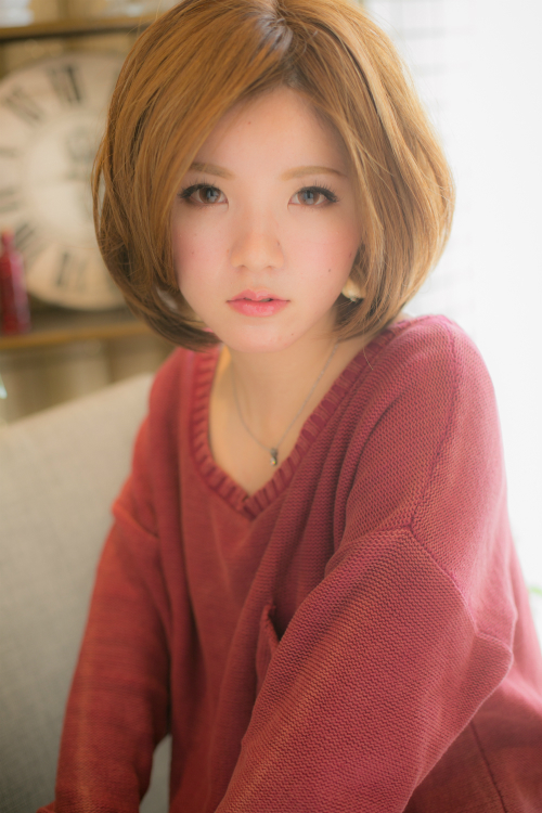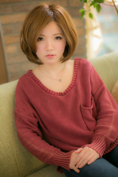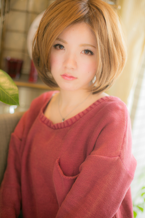 あご下のカットラインが小顔効果をつくりだし、ハチ上からレイヤーをいれてふんわり感もプラス。アウトラインはワンカールのパーマをかけシルエットの丸みが女の子らしさを♪アッシュ系のカラーで柔かい質感を。