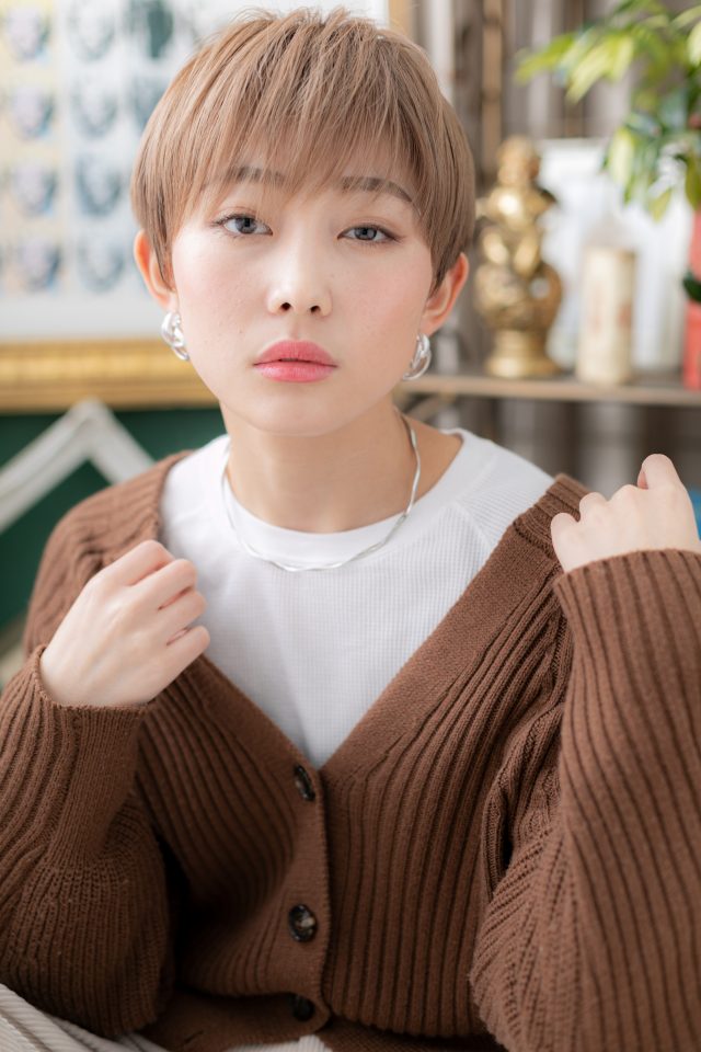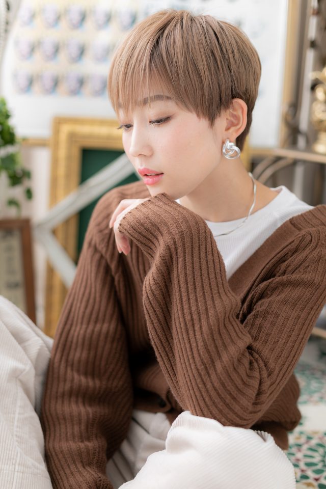 ショート初挑戦の方にオススメの小顔フェミニンショートのヘアスタイル。トリートメンしたようなカラーリングで髪の毛の悩みも解決!人気のカラーやグラデーションやベージュの暗めの髪の色もおすすめ!30代・40代にもおすすめ!(メイク担当:北浦和店棟方)