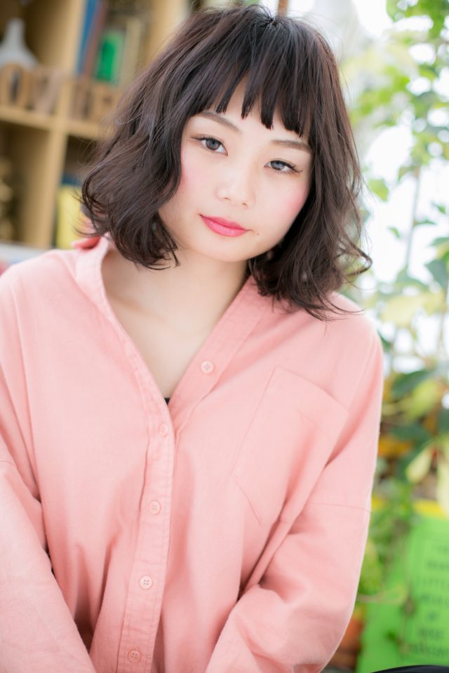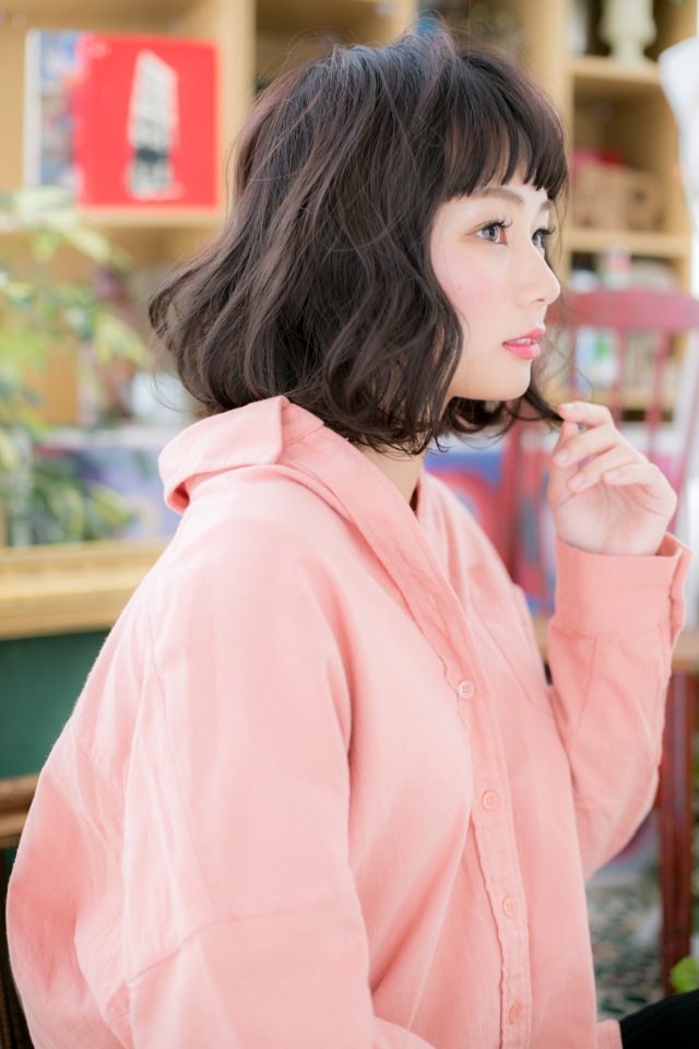 ショートバングとくせ毛風のゆるカールでカジュアルに仕上げたふわミディのヘアスタイル。黒髪でも重めスタイルにならず、ラブガーリーな印象にヘアアレンジし大人女子のコーデを完成!。ミディアムヘアを際立たせるグラデーションでトリートメントしたようなカラーリングで髪の毛の悩みも解決!人気のカラーやピンク系のカラーも◎30代・40代にもおすすめ!