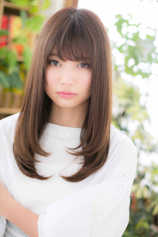 ハイレイヤーで立体感を出しグラマラスに仕上げたエアリーロングのへスタイル。斜めバングや厚めバングで目元を印象つけて大人女子のコーデを完成。ニュアンス感ある動きを出せば、黒髪でも重めスタイルになりません。前下がりで小顔見せ効果もバッチリ♪トリートメントしたようなカラーリングで髪の毛の悩みも解決!30代・40代にもおすすめ!