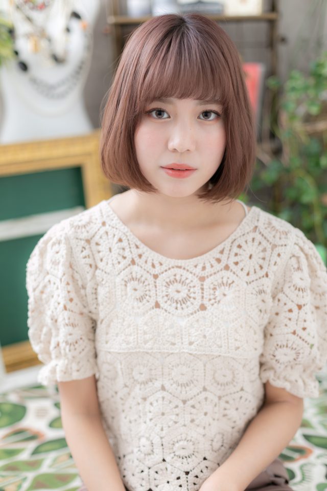 頬ラインに沿った前下がりワンカールで輪郭カバーで小顔見せを叶えるナチュラルボブのヘアスタイル。フェミニンボブや大人ボブ、エアリーボブや前下がりボブなどヘアアレンジもOK。トリートメントしたようなカラーリングもおすすめ!