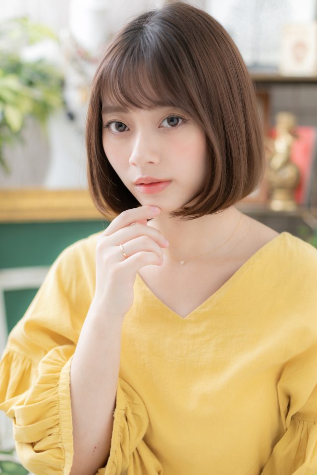 シンプルで大人かわいいナチュラルボブ。前下がりで小顔&好感度大のヘアスタイルに大人女子のコーデも完成。ミディアムヘアを際立たせるグラデーションやベージュの暗めの髪の毛もおすすめ。(メイク担当:北浦和店 棟方)
