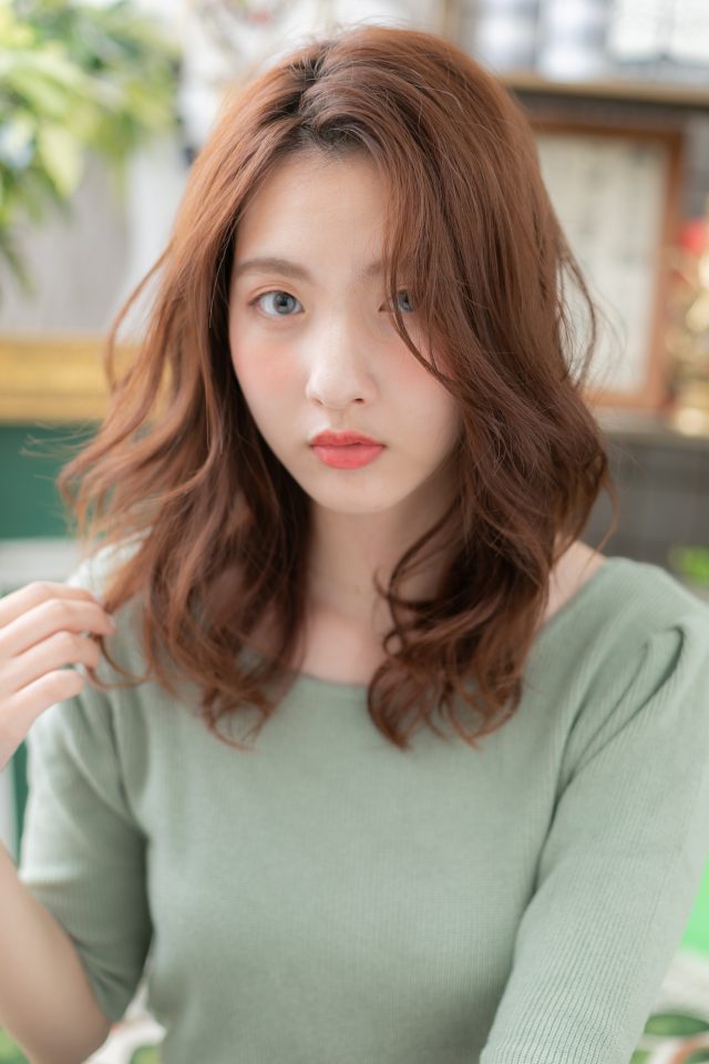 無造作なかきあげバングで色気を醸すおフェロな印象のくせ毛風ふわミディ。センターパートでクラシカルにしたり、耳かけやワンサイドのアシンメトリーなヘアアレンジも大人かわいいヘアスタイル。30代・40代にもおすすめ!(メイク担当:北浦和店 棟方)