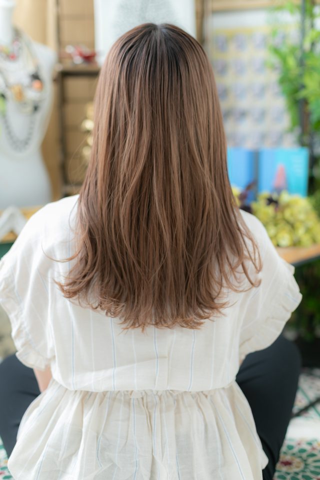 シースルーバングと外国人風ミルクティーブラウンで透け感たっぷりに仕上げた大人女子ナチュラルストレート。トリートメントしたようなカラーリングで髪の毛の悩み解決!30代・40代にもおすすめ!