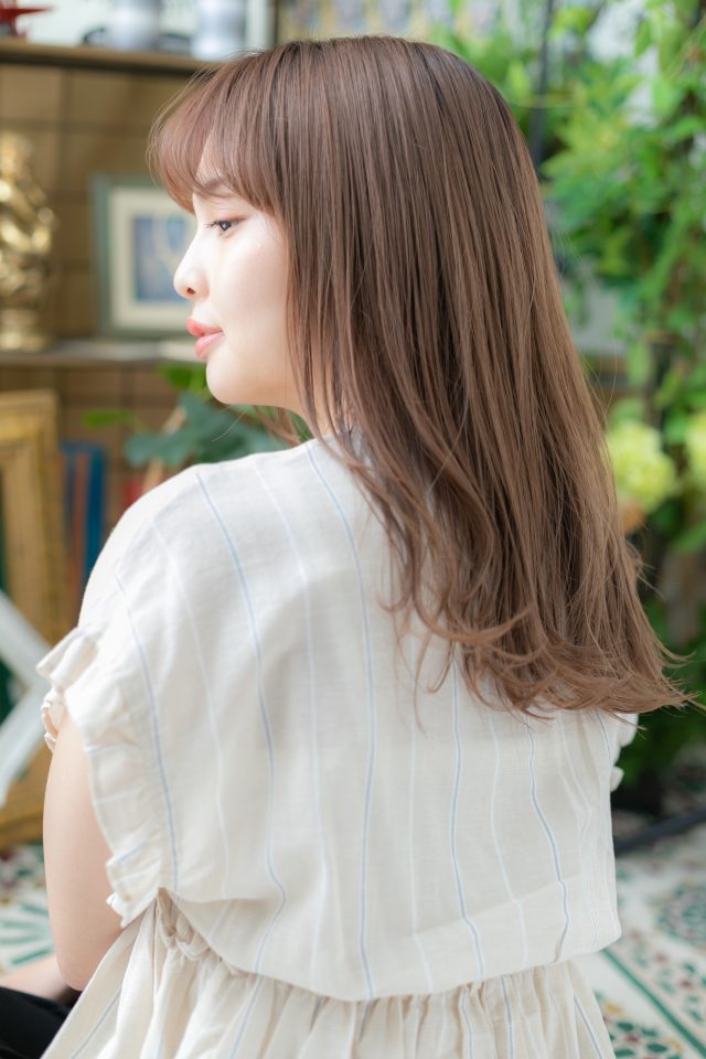 シースルーバングと外国人風ミルクティーブラウンで透け感たっぷりに仕上げた大人女子ナチュラルストレート。トリートメントしたようなカラーリングで髪の毛の悩み解決!30代・40代にもおすすめ!