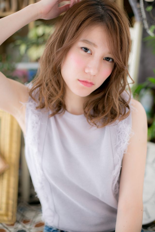 透け感ある斜めバングで表情をチラ見せした、色っぽかわいいふわミディ。厚めバングやワイドバングで個性的にしたり、耳かけも大人かわいい。くせ毛風カールのふわミディでモテ髪に♪(メイク担当:北浦和店 近藤)
