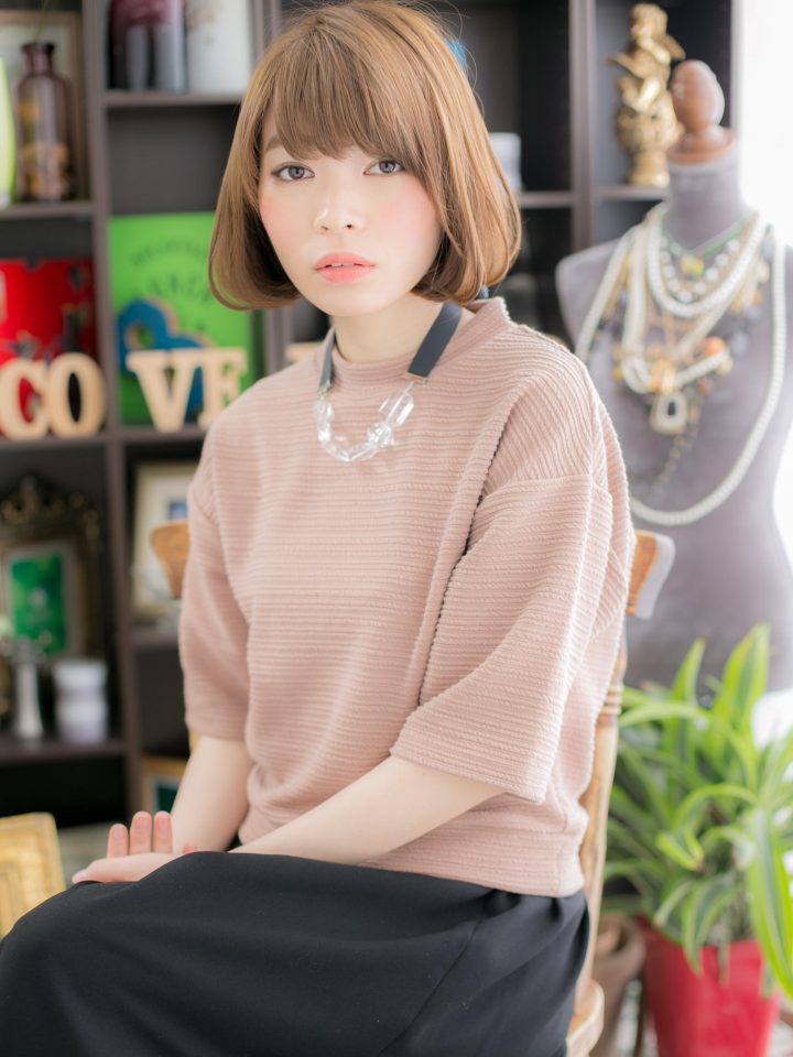 ワンレングスのナチュラルボブにハイトーンのイエローアッシュ系のカラーで個性的に☆斜めバングや厚めバングも◎くせ毛風カールをつけたフェミニンボブや前下がりボブ、クールな大人ボブのイメチェンもGOOD!