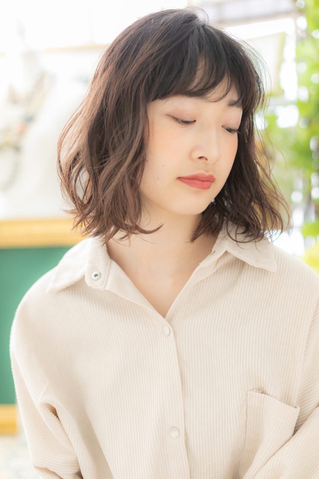 斜めバング,厚めバングで目力UP。くせ毛風ふわミディやかきあげ前髪も大人かわいい。耳かけや前下がりで小顔。ナチュラルボブやフェミニンボブ,大人ボブや前下がりボブからのイメチェンに。(メイク担当:川口店 成田)