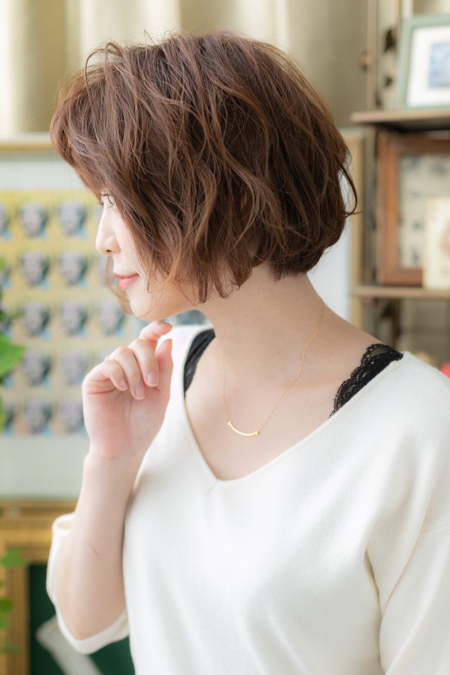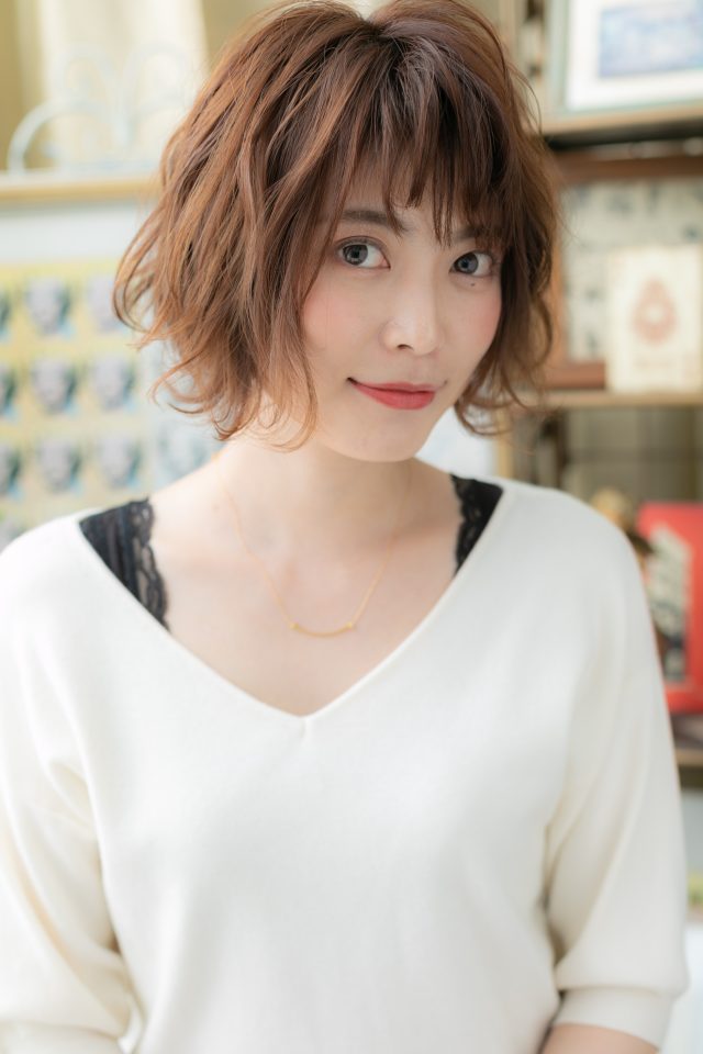 くせ毛風ゆるふわミディや耳かけが大人かわいい。前下がりで小顔。斜めバングや厚めバング、かきあげ前髪で目力UP。ナチュラルボブやフェミニンボブ、大人ボブや前下がりボブの伸ばしかけに◎(メイク担当:川口店 岩淵)