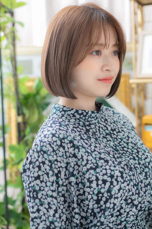 大人かわいいハイトーンカラーの韓国風ナチュラルボブ。フェミニンボブや大人ボブ、前下がりボブも人気。くせ毛風ゆるふわミディや耳かけ前下がりで小顔。斜めバングや厚めバングで目力UP。(メイク担当:北浦和店 成田)