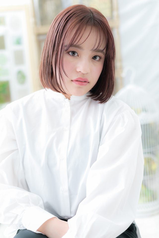 韓国風ベージュピンク小顔切りっぱなしボブ