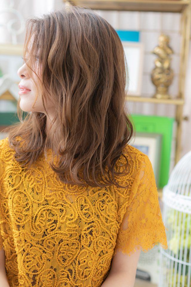 暖色系カラーくせ毛風大人巻き抜け感ミディ