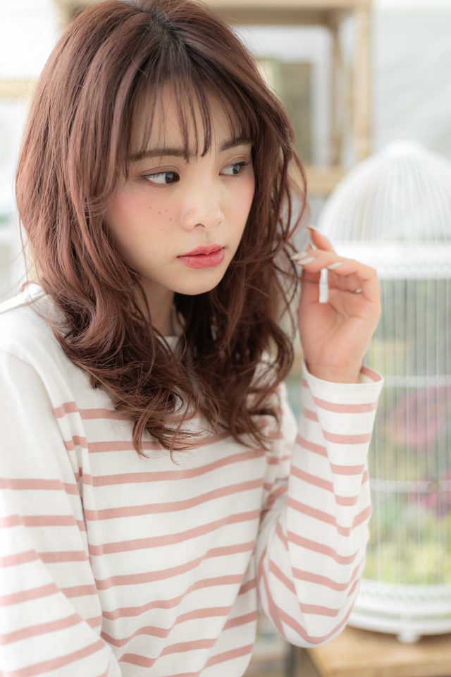 くせ毛風ゆるふわミディ耳かけ前下がりウルフで小顔。ナチュラルボブフェミニンボブ,大人ボブ前下がりボブ,ミニボブが大人かわいい。斜めバング厚めバング,シースルーバングかきあげ前髪も◎
