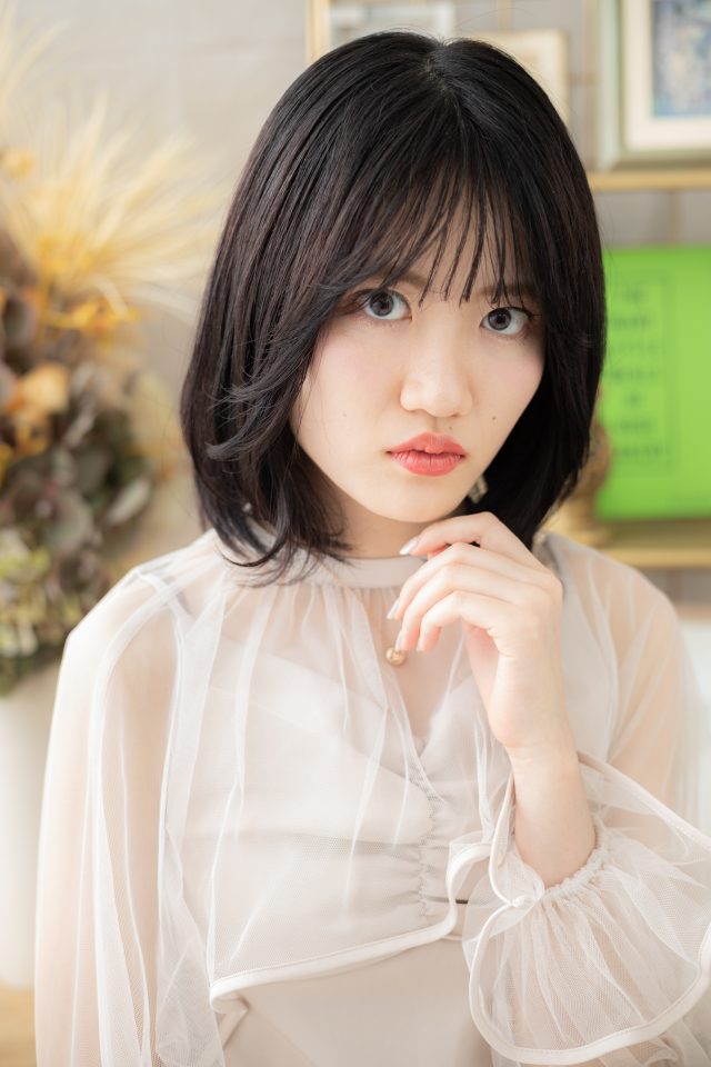 シースルーバングかきあげ前髪、厚めバング斜めバングで小顔。前下がりボブミニボブ、マッシュボブ大人ボブから伸ばしかけに◎くせ毛風ゆるふわミディや耳かけ前下がりウルフも大人かわいい。(メイク担当:北浦和店中野)